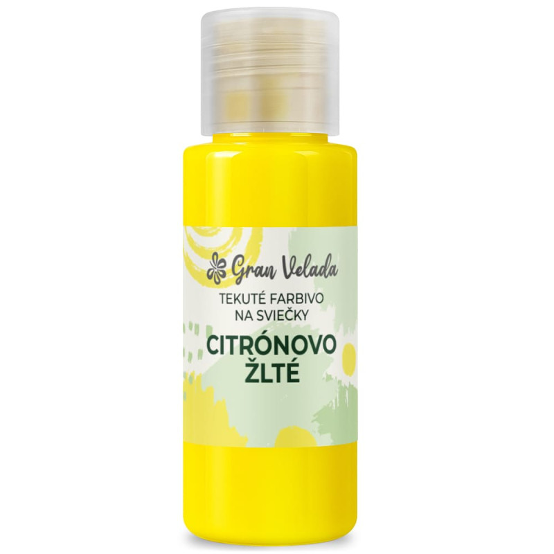 Citrónovo žlté tekuté farbivo na výrobu sviečok. Je k dispozícii v rôznych veľkostiach. Tekuté farbivá na sviečky sú pohodlné a praktické, pretože sa veľmi ľahko používajú: stačí pridať niekoľko kvapiek do roztopeného parafínu, aby sa sfarbil. Keďže sú koncentrované, ich použitie je veľmi cenovo výhodné a úsporné. Ľahko sa rozptyľujú a nezanechávajú hrudky. Získaš žlté sviečky, ktoré budú vyžarovať radosť a svetlo. Žltá farba sa totiž spája s vitalitou.
