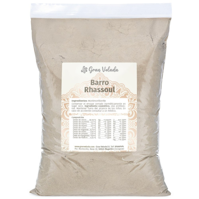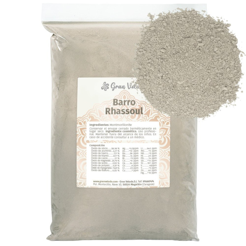 V Gran Velada vám ponúkame možnosť zakúpenia ghasssoul ílového (alebo rhassoul) prášku. Je 100% čistý a prírodný a ťaží sa z baní marockého stredného Atlasu. Je to produkt bohatý na kremík, horčík, železo, vápnik a draslík, ktorý arabské ženy široko používajú ako zložku kozmetiky na starostlivosť o pokožku a vlasy.