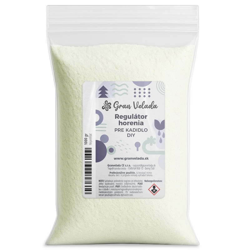 Regulátor horenia pomáha domácemu kadidlu lepšie horieť a nevychádzať von. Týmto spôsobom vydávajú svoju vôňu dlhšie. V našom internetovom obchode si môžete kúpiť regulátor horenia vo veľkom. Je to biely prášok, ktorý je kombinovaný s drevnou múkou a začlenený do zvyšku prípravku. V našich blogoch môžete vidieť rôzne recepty na výrobu kadidla a skontrolovať , ako používať regulátor horenia. V Gran Velade nájdete všetky potrebné ingrediencie, aby ste si mohli vyrobiť vlastné kadidlo a my vám ukážeme, ako sa vyrábajú.