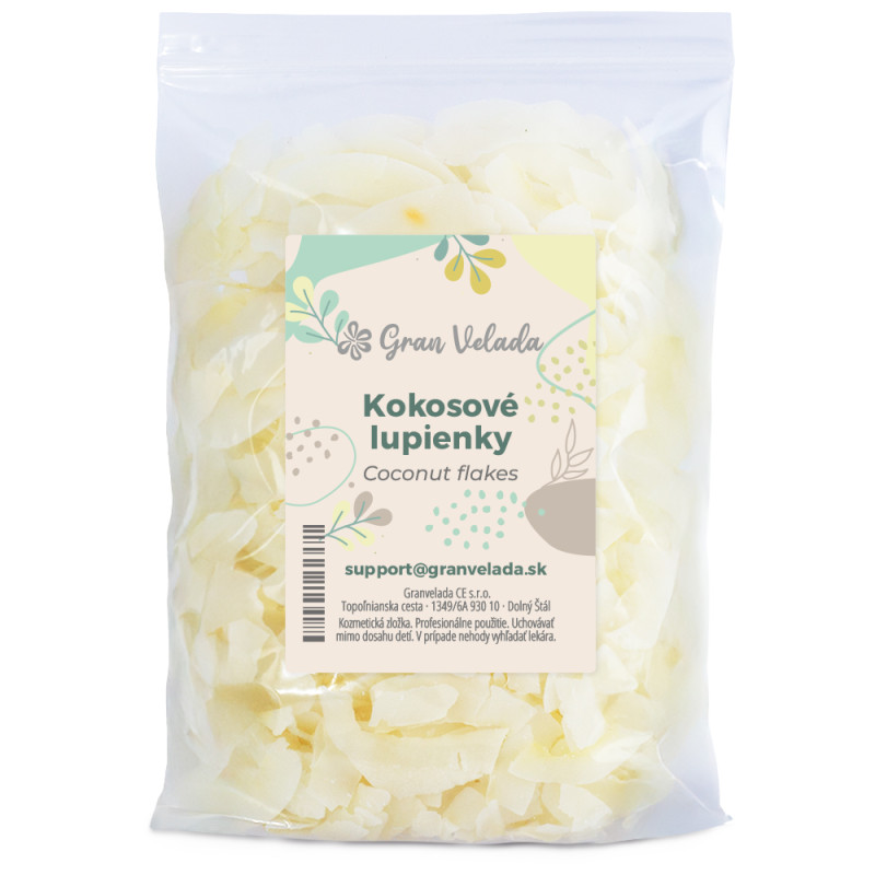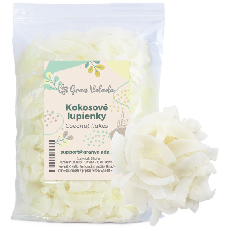 Kokosové plátky, dehydrovaný kokosový orech v tenkých plátkoch, bielej farby a typickej vône. Prírodná zložka určená pre kozmetiku typu "urob si sám", použiteľná ako mierny rastlinný peeling, dekoračný prvok v mydlách a základ pre máčadlá s olejmi inšpirovanými tropickými podnebiami. Suchý a stabilný výrobok, ľahko sa skladuje a manipuluje s ním.