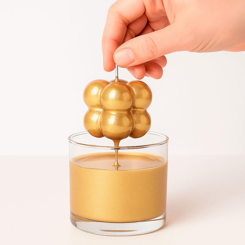 Zlatý lak na sviečky , s ktorým dosiahnete, aby vaše sviečky mali peknú farbu a kovový efekt. Ľahko získate zlaté sviečky, ideálne na zdobenie alebo rituály. Tento lak sa ľahko nanáša a rýchlo schne a s ním budete môcť rýchlo a ľahko zmeniť vzhľad vašich sviečok. Naše odporúčanie je, aby ste lak nanášali ponornou technikou, ako je uvedené nižšie. Pri použití laku na sviečky sa odporúča, aby základná sviečka mala svetlé farby a aby bol povrch dobre vyčistený. Ak sú tmavé, bude potrebné urobiť niekoľko ponorných kúpeľov, aby bol povrch dokonalý. Je to kvalitný lak , ktorý neovplyvní horenie sviečky. Okrem toho počas spaľovania nevytvára zápach. Pred použitím premiešajte, ako je podrobnejšie vysvetlené.