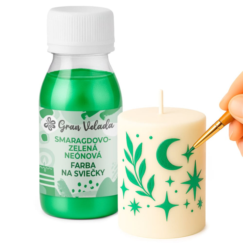 Farba na sviečky, ktorú si môžete kúpiť v našom internetovom obchode, je špeciálne určená na maľovanie na voskové povrchy. Dodáva sa v tekutej forme a je k dispozícii v širokej škále farieb s metalickými, perleťovými, neutrálnymi a neónovými odtieňmi. Najmä metalická smaragdovo zelená vyniká svojím elegantným a lesklým povrchom, ktorý je ideálny na pútavé vzory, ozdobné detaily a exkluzívne efekty.