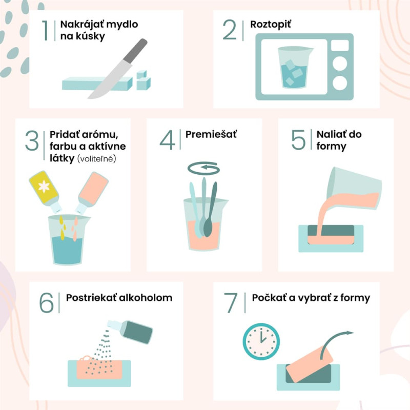 Do tejto mydlovej hmoty môžeš pridať vône do mydla, farbivá na mydlá a naliať ju do formy na výrobu mydla. Keďže je transparentná, výsledné mydlá budú mať jasné a intenzívne farby.