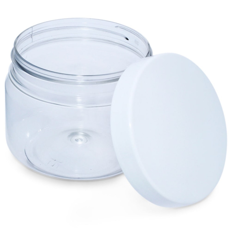 Priehľadná nádoba s objemom 200 ml s bielym vekom, veľmi praktická na balenie krémov a všetkých druhov kozmetiky. Kontajnery sa predávajú prázdne a skladajú sa z kruhovej priehľadnej nádoby, ktorá je sprevádzaná bielym plastovým vekom, ktoré sa uzatvára skrutkou. Tieto plastové nádoby je možné opätovne použiť a recyklovať.