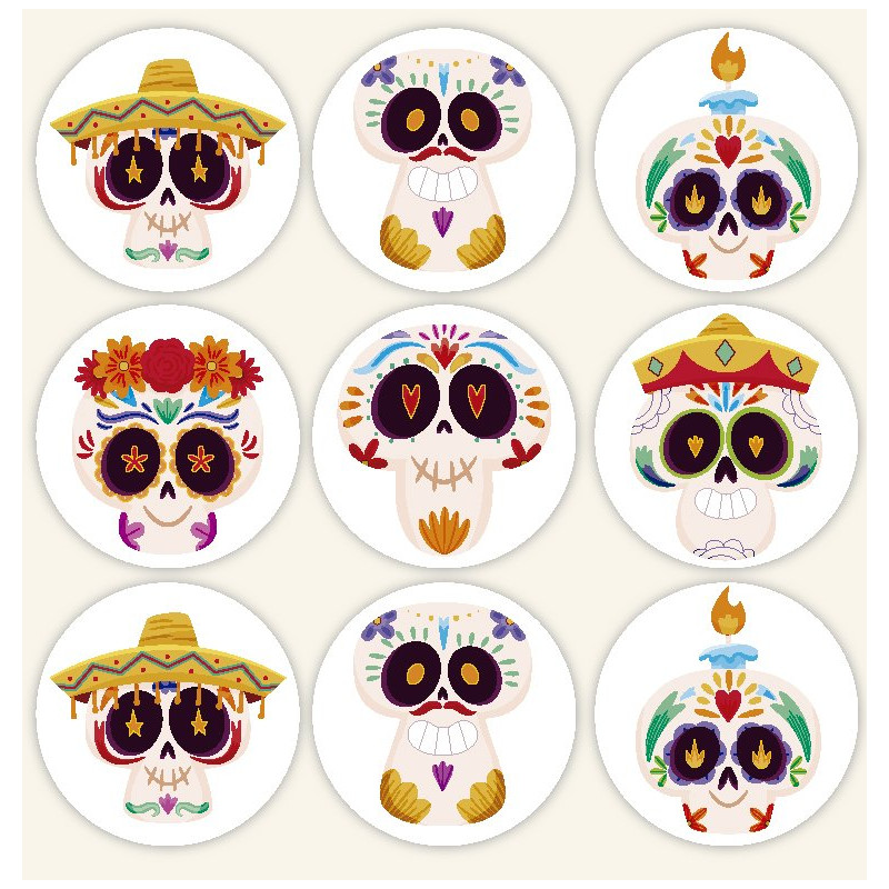 Blister s 9 samolepkami s priemerom 4 cm so štýlovými a farebnými motívmi Katrinas de muerte. Každá z nálepiek je jedinečná, so živými detailmi zobrazujúcimi tradičné mexické lebky, zdobené sombrerami, kvetmi a slávnostnými vzormi. Tieto nálepky sú ideálne na projekty DIY dekorácií alebo na dodanie kultúrneho a slávnostného nádychu vašim výtvorom na Halloween alebo Deň mŕtvych.
