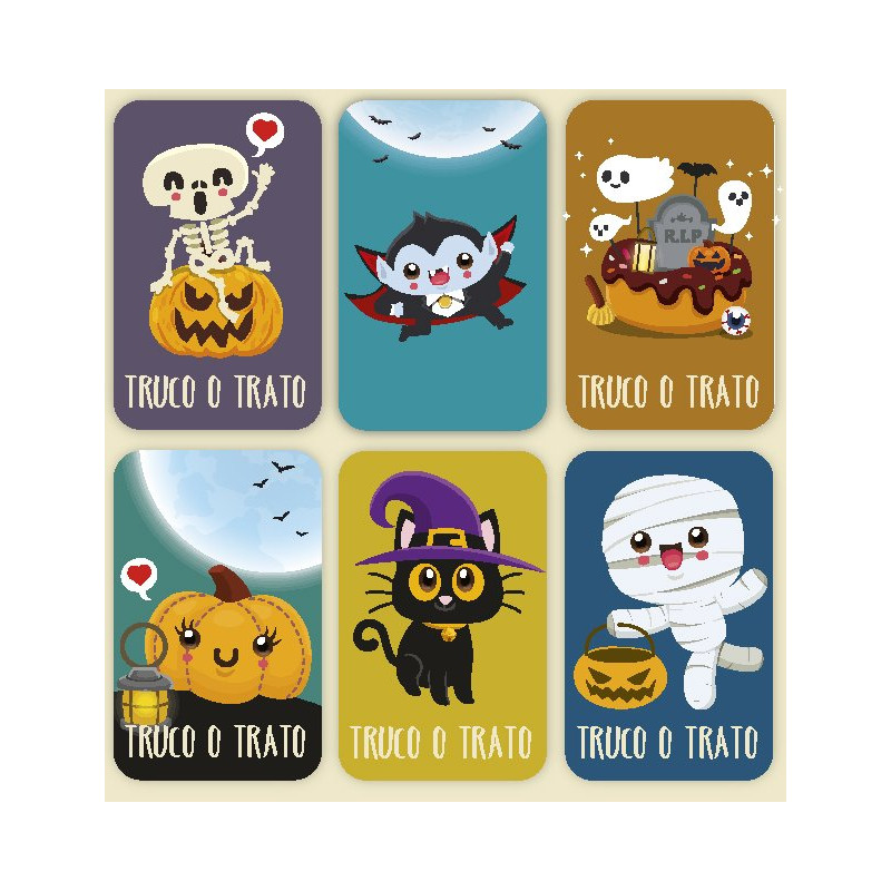 Blister so 6 obdĺžnikovými nálepkami s výškou 5 cm a šírkou 31 mm so zábavnými a farebnými halloweenskými motívmi. Tieto nálepky obsahujú ilustrácie slávnostných postáv, ako sú lebky, tekvice, duchovia, mačky a ďalšie, ktoré sú ideálne na dodanie jedinečného a slávnostného nádychu vašim DIY projektom alebo Halloweenskym dekoráciám.