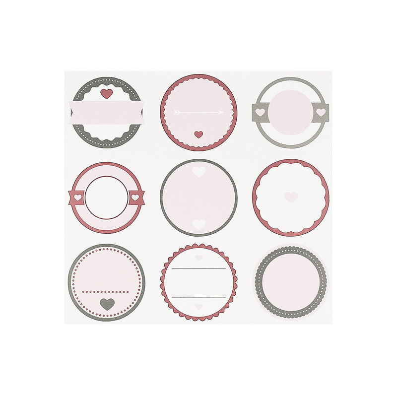 Blister z 9 okrúhlych nálepiek, 3,5 cm, na písanie na to, čo chcete. Majú romantický dizajn so srdiečkovými potlačami. Každý blister kombinuje rôzne modely nálepiek. Sú špeciálne navrhnuté tak, aby ste o nich mohli písať, a sú veľmi užitočné pri výrobe detailov, darčekov, domácich výrobkov ... Naše samolepky vynikajú svojou odolnosťou a kvalitou. Perfektne priľnú na rôznych typoch povrchov (lepenka, papier, plast, sklo, hliník...) a sú vodeodolné. Získajte tieto nálepky a získajte perfektné balenie pre svoje svojpomocné spracovanie.