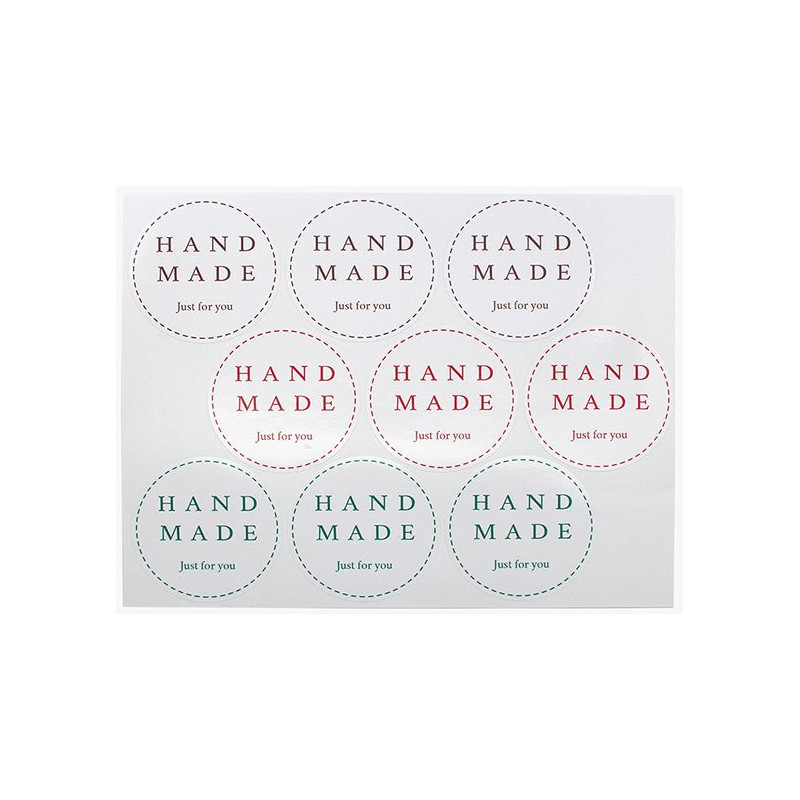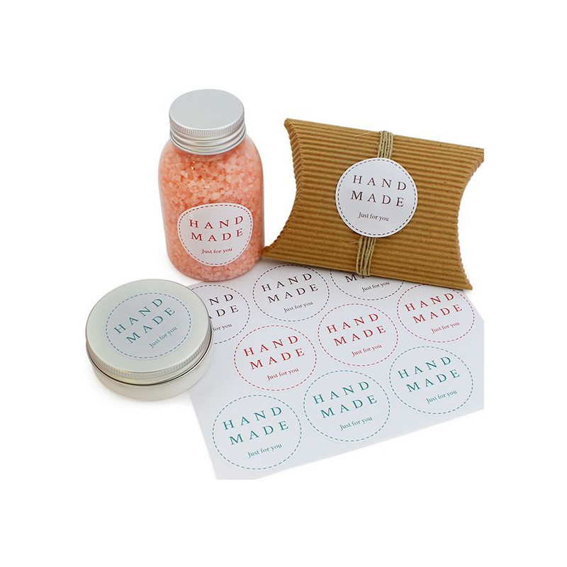 Blister z 9 ručne vyrobených samolepiek s priemerom 5 cm na ozdobenie nádob alebo darčekov. Sú to okrúhle nálepky s bielym pozadím a mení farbu typografie: sú tu 3 čierne, 3 červené a 3 zelené. Môžete ich použiť ako nálepky na balenie tašiek, pohárov, darčekových krabíc, obálok, mydiel, kozmetiky, sviečok ... a všetkého, na čo si spomeniete! Nálepky, ktoré si môžete kúpiť v Gran Velada, vynikajú svojou odolnosťou a kvalitou. Perfektne priľnú na rôznych typoch povrchov (lepenka, papier, plast, sklo, hliník...) a sú vodeodolné. Získajte tieto nálepky a získajte perfektné balenie pre svoje DIY spracovanie!