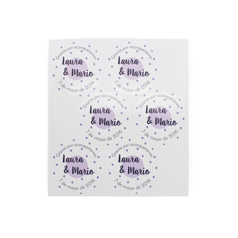 Balenie 26 samolepiek s bodkami s priemerom 5,6 cm na personalizáciu s menami, dátumom a udalosťou podľa tvojho výberu. Na výber sú v šiestich farbách. Sú ideálne na balenie svadobných výslužiek, krstu, svätého prijímania, firemných akcií... Tieto personalizované nálepky sú okrúhle, majú biele pozadie a menia farbu bodiek. Dokonale držia na rôznych typoch povrchov (kartón, papier, plast, sklo, hliník...) a sú odolné voči vode. Kúp si tieto samolepky a získaj dokonalý obal na tvoje výslužky! V prípade personalizovaných nálepiek neprijímame platby na dobierku.