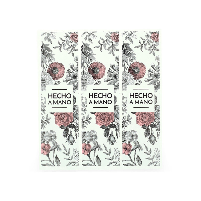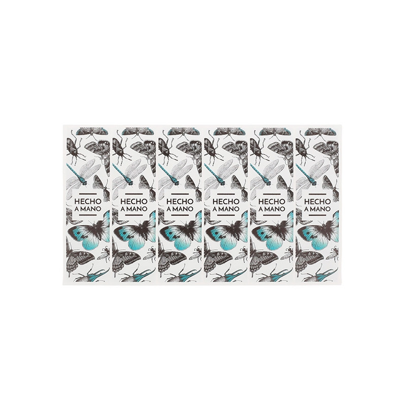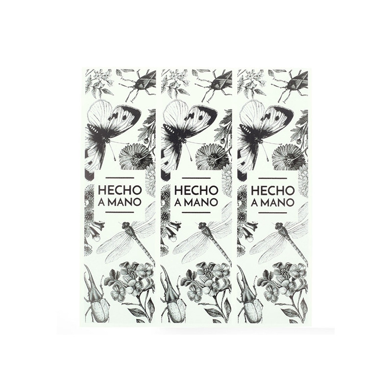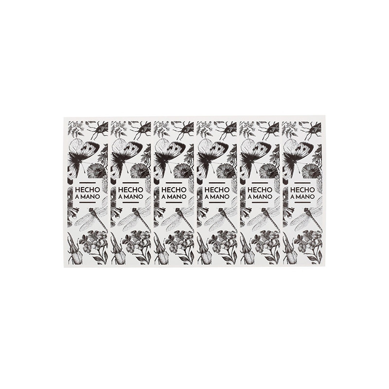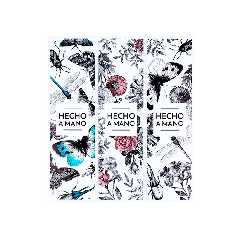 Pomocou týchto nálepiek s kvetmi a hmyzom môžeš tvojim kozmetickým výrobkom dodať exkluzívny nádych. Sú to podlhovasté, obdĺžnikové nálepky inšpirované botanickými motívmi. Na výber sú štyri možnosti: kúpiť si môžeš iba nálepky kvetov s ružovými odtieňmi; kúpiť si iba nálepky hmyzu s modrými odtieňmi; čiernobiely model, ktorý kombinuje oba motívy; alebo kombináciu týchto troch modelov. V strede všetkých nálepiek si môžeš veľkými písmenami prečítať nápis "Handmade". Sú ideálne na elegantné balenie.