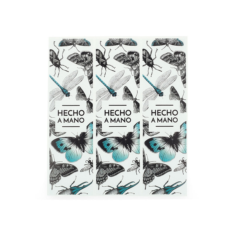 Nálepky s hmyzom sú tiež vytlačené na bielom pozadí a majú matný povrch. V tomto prípade je farebný nádych modrý. Motýle, vážky, chrobáky... sú niektoré z druhov hmyzu, ktoré sa objavujú na týchto botanických ilustráciách.