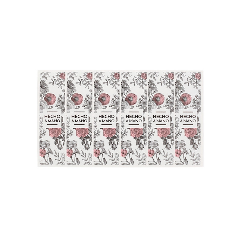 Nálepky kvetov kombinujú rôzne botanické druhy a prevládajú v nich ružové tóny. V strede ilustrácie, rovnako ako na ostatných modeloch, je na nich nápis: "Handmade", napísaný veľkými písmenami a s typografiou v čiernej farbe.