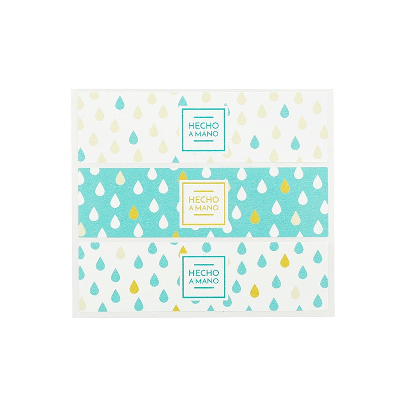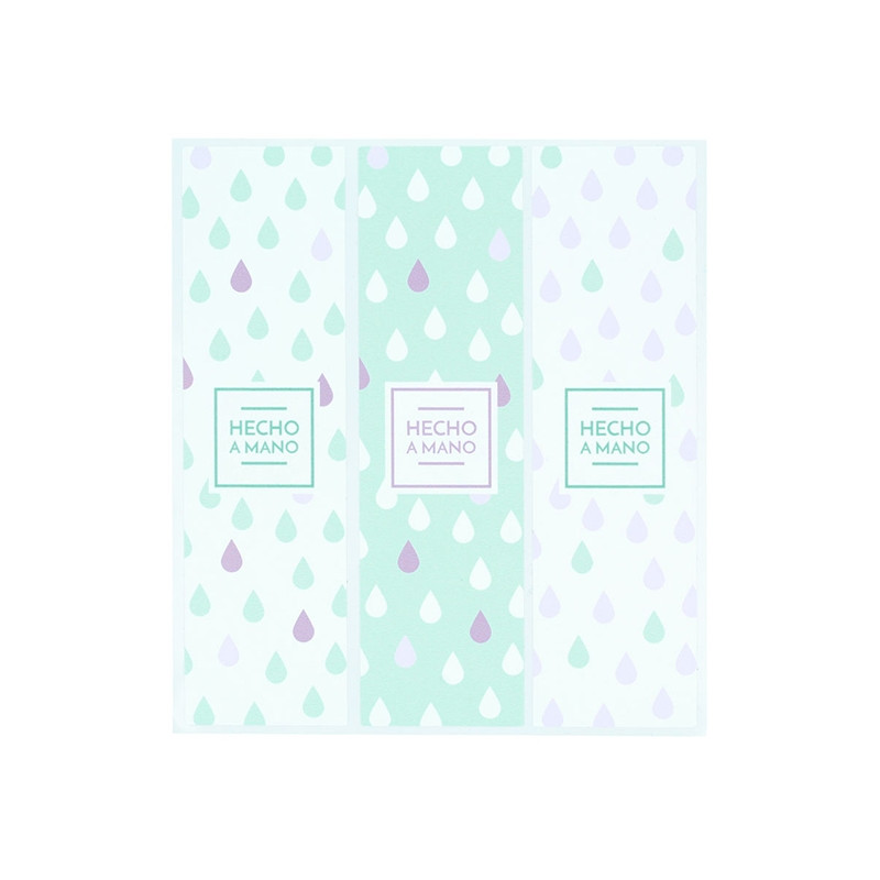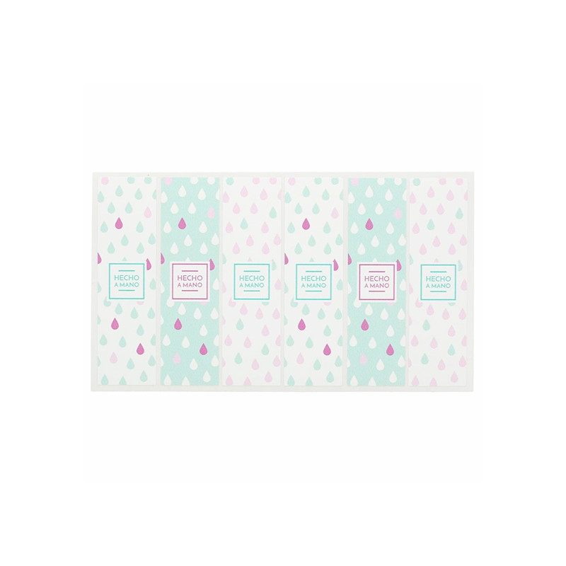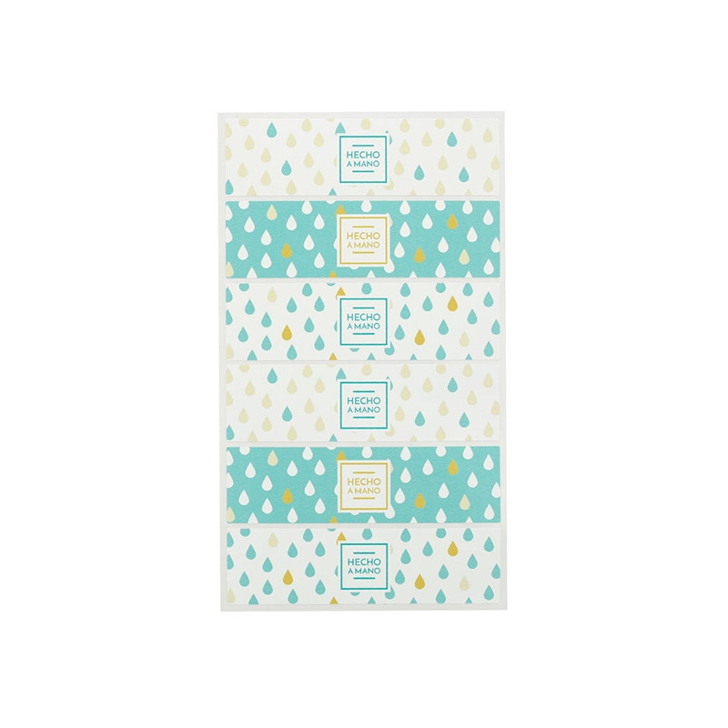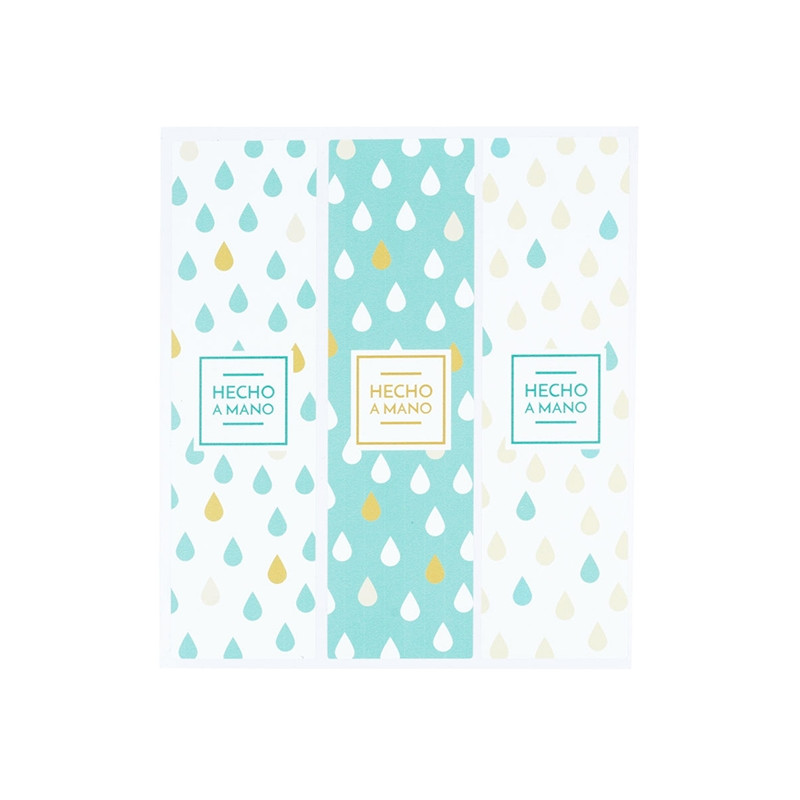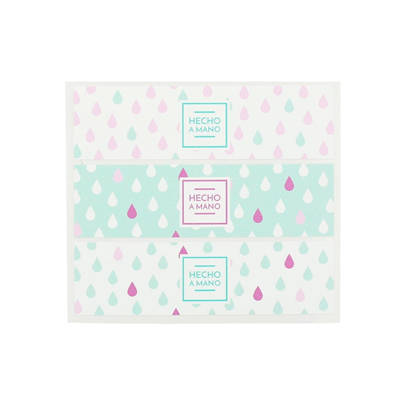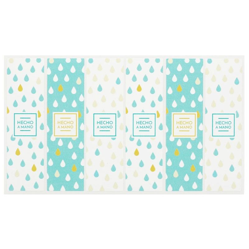 Nálepky s kvapkami vody, ktoré sú k dispozícii v spoločnosti Gran Velada, majú jedinečný dizajn pozostávajúci z pozadia pokrytého farebnými kvapkami s nápisom "handmade" v strede na bielom poli.