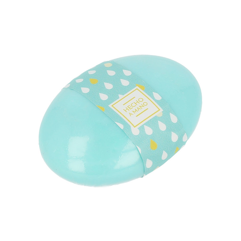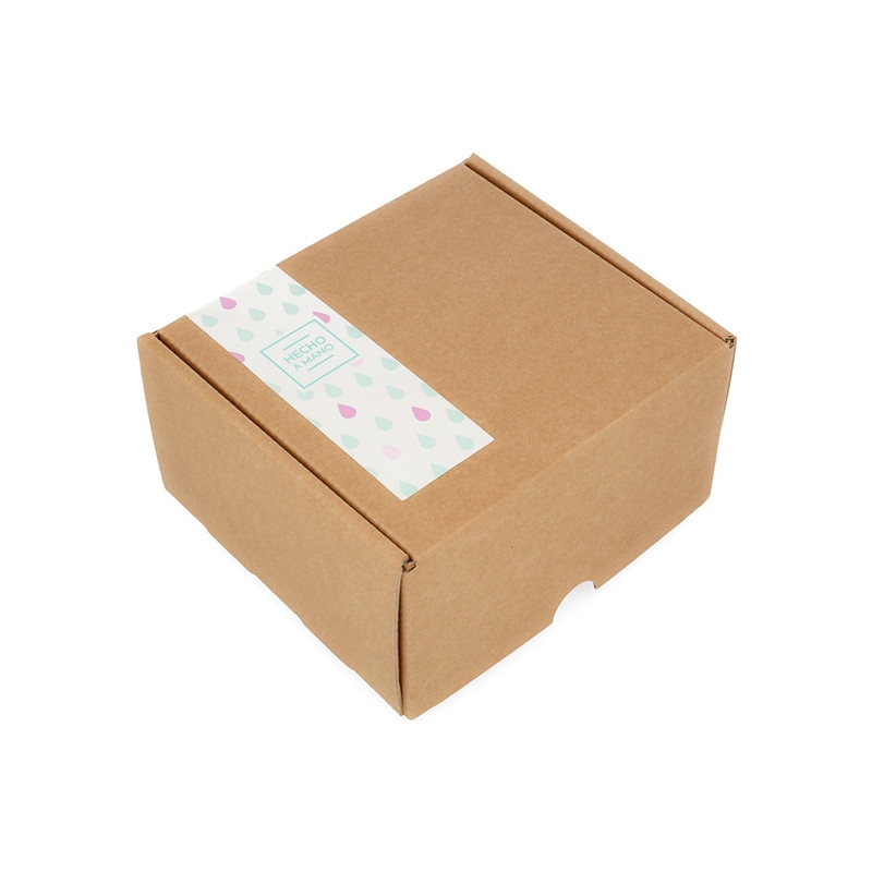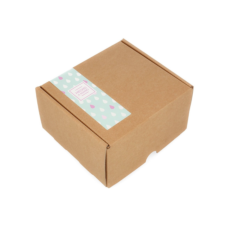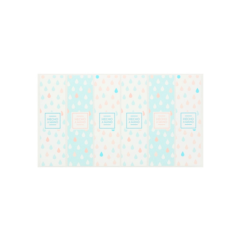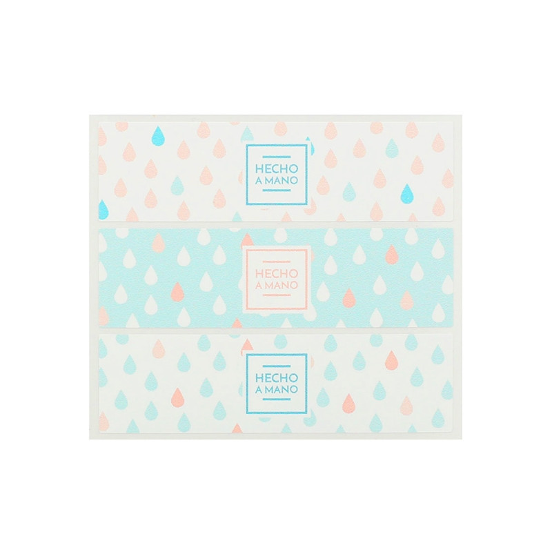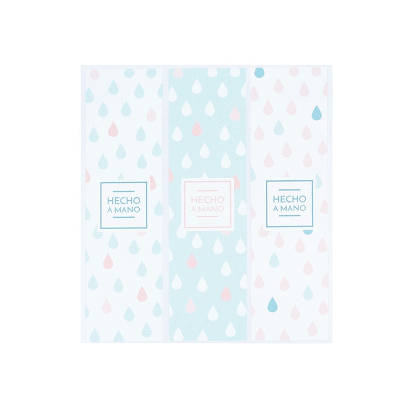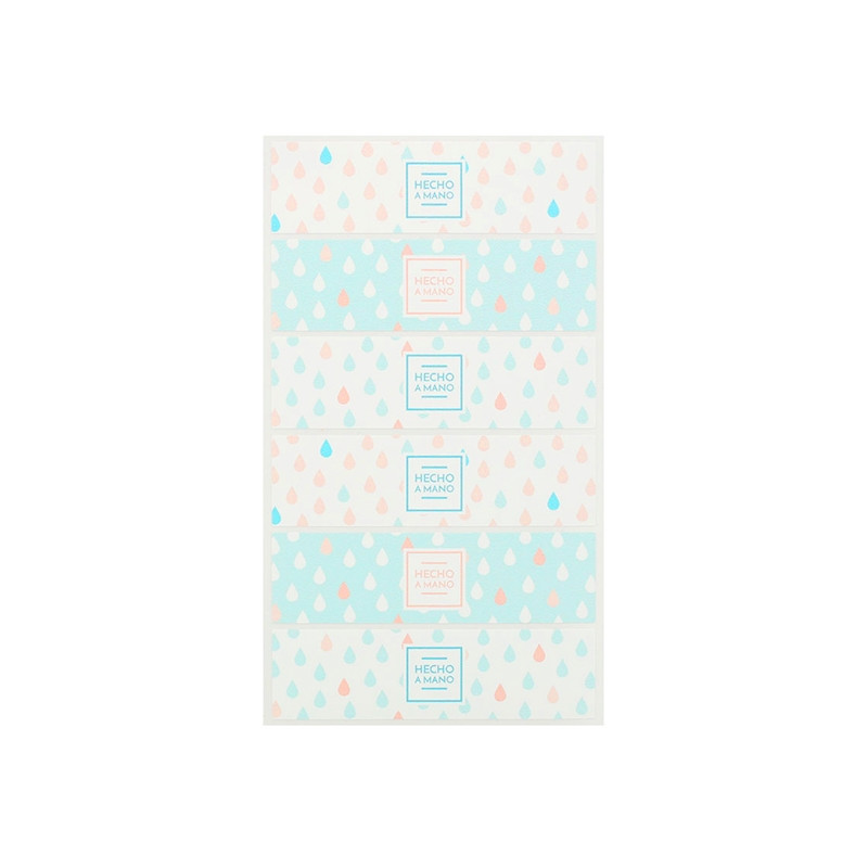 Nálepky s kvapkami vody, ktoré sú k dispozícii v spoločnosti Gran Velada, majú jedinečný dizajn pozostávajúci z pozadia pokrytého farebnými kvapkami s nápisom "handmade" v strede na bielom poli.