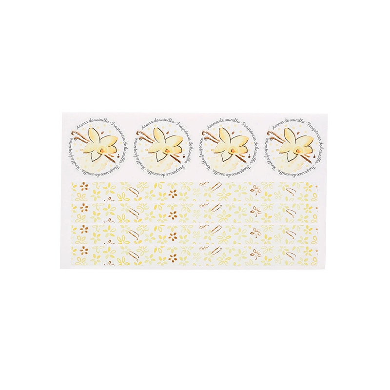 Vanilkové etikety, ideálne na personalizáciu tvojich ručne vyrábaných výrobkov s vôňou vanilky. Sú k dispozícii v dvoch prevedeniach. V okrúhlom variante sa v strede nálepky nachádza vanilkový kvet s vanilkovými strukmi a okolo neho si môžeš prečítať označenie vanilkovej arómy v niekoľkých jazykoch. Dlhá ozdobná stuha je zdobená vyobrazením malých vanilkových kvetov a ich strukov.