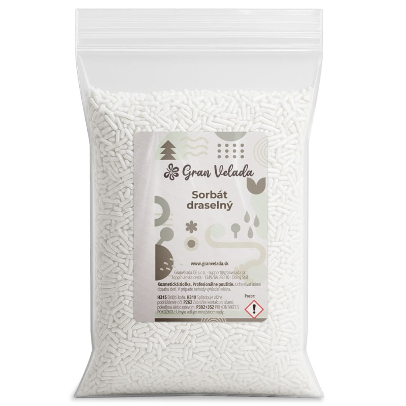 Sorbát draselný je konzervačná látka používaná v kozmetike na zabránenie rastu húb, kvasiniek a baktérií. Je ideálny na konzervovanie produktov ako sú hydratačné krémy, mlieka, gély, šampóny a pleťové masky. Sorbát draselný, ktorý ponúkame v Gran Velada, je najvyššej kvality s minimálnou čistotou 99 %, čo zaručuje jeho účinnosť ako konzervant v kozmetických produktoch. Ide o biely granulovaný prášok s vysokou rozpustnosťou vo vode a pH v 10 % vodnom roztoku medzi 8,5 – 10,5, čo z neho robí ideálnu voľbu pre formuláciu bezpečnej a účinnej kozmetiky.