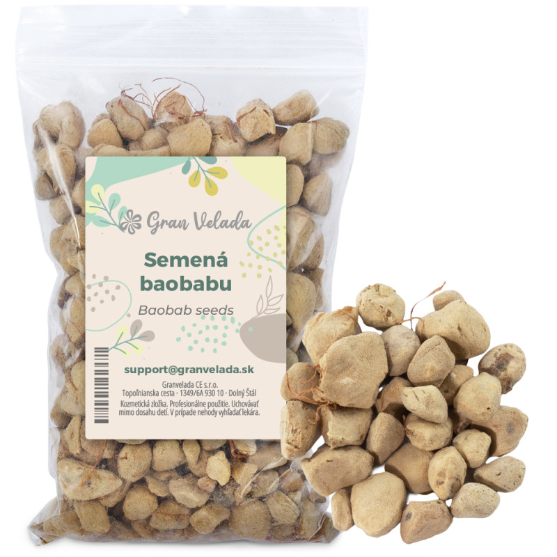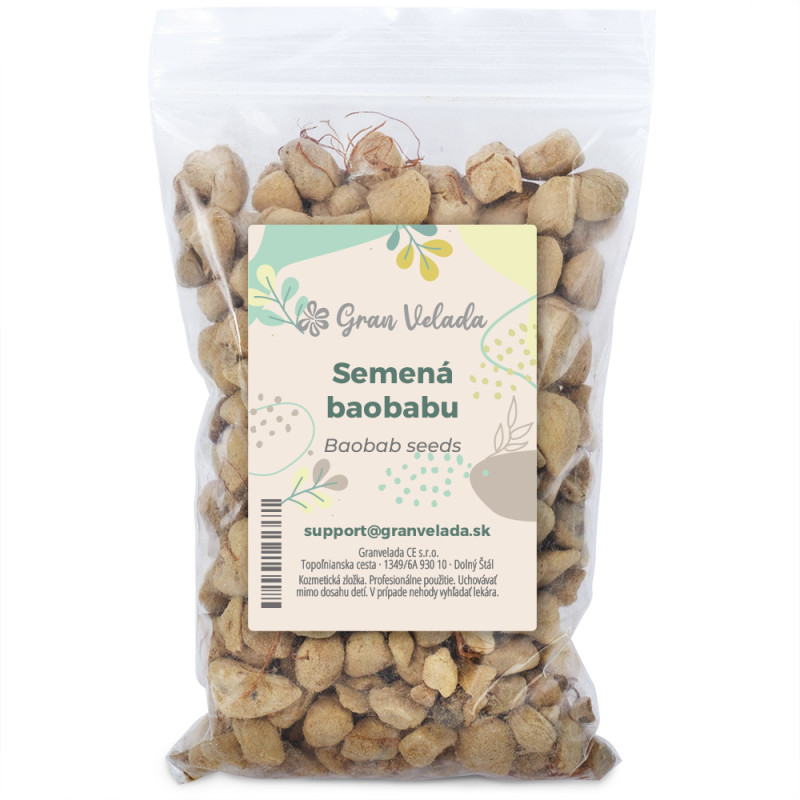 Baobab fazuľový, sušené semená z Adansonia digitata, známeho aj ako strom života, strom fľaše alebo opičí chlieb. Vynikajú obsahom esenciálnych mastných kyselín a vitamínov A, C a E s výživnými, antioxidačnými a hydratačnými vlastnosťami. Prísada tradične používaná v bylinných prípravkoch na revitalizáciu a ochranu pokožky. Môže sa používať ako rastlinný základ v prírodných prípravkoch domácej kozmetiky.